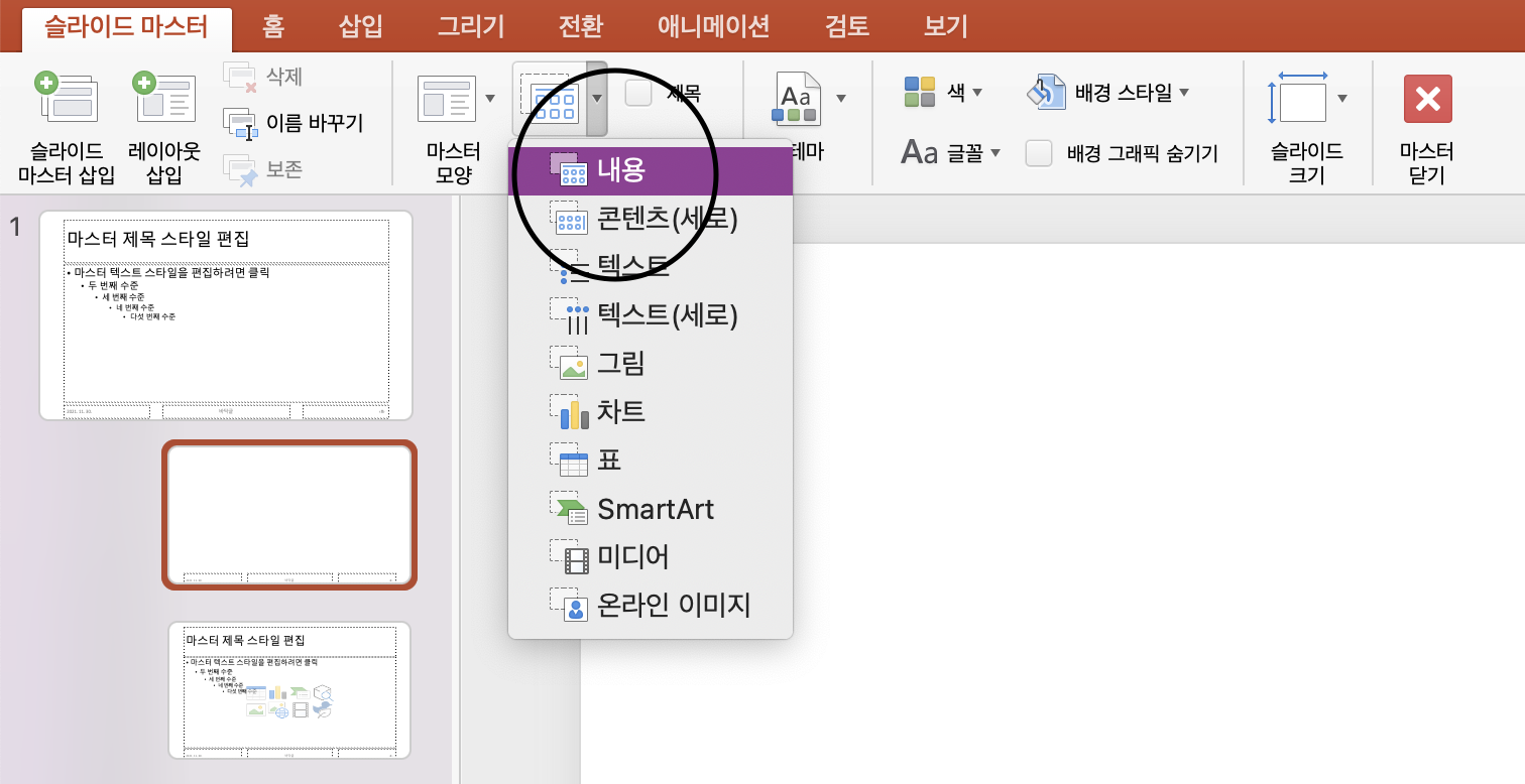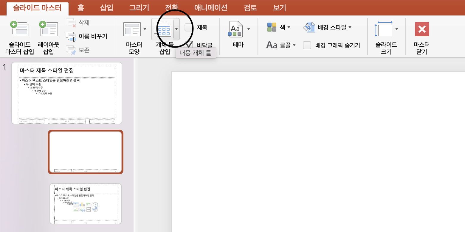 슬라이드 마스터에서 텍스트를 편집할 수 있는 텍스트 틀을 추가하는 방법입니다.