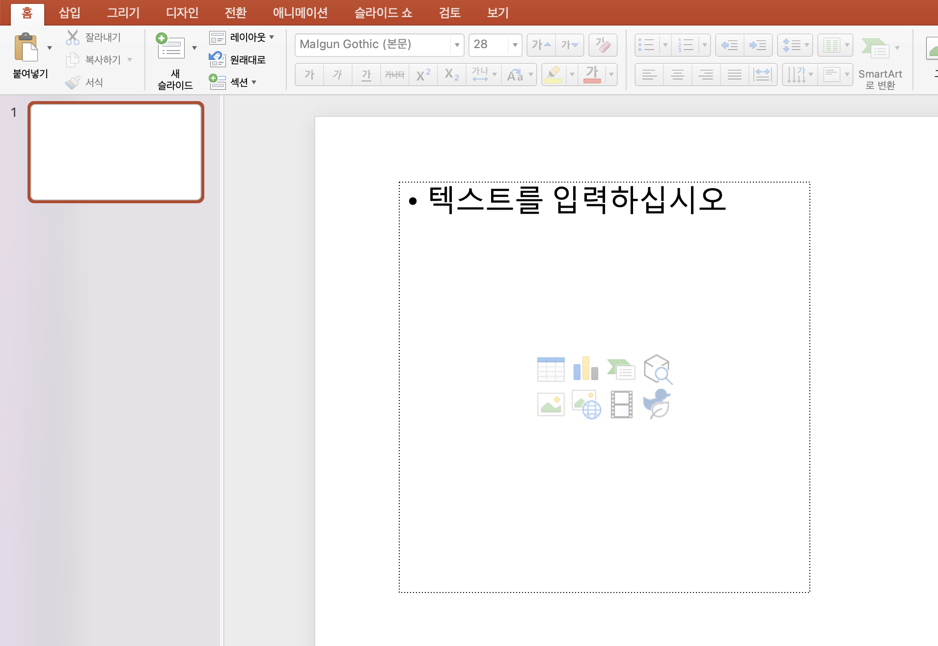 2. [개체 틀 삽입]메뉴의 조그만 드롭다운메뉴 (세모)를 눌러 내용을 추가합니다.