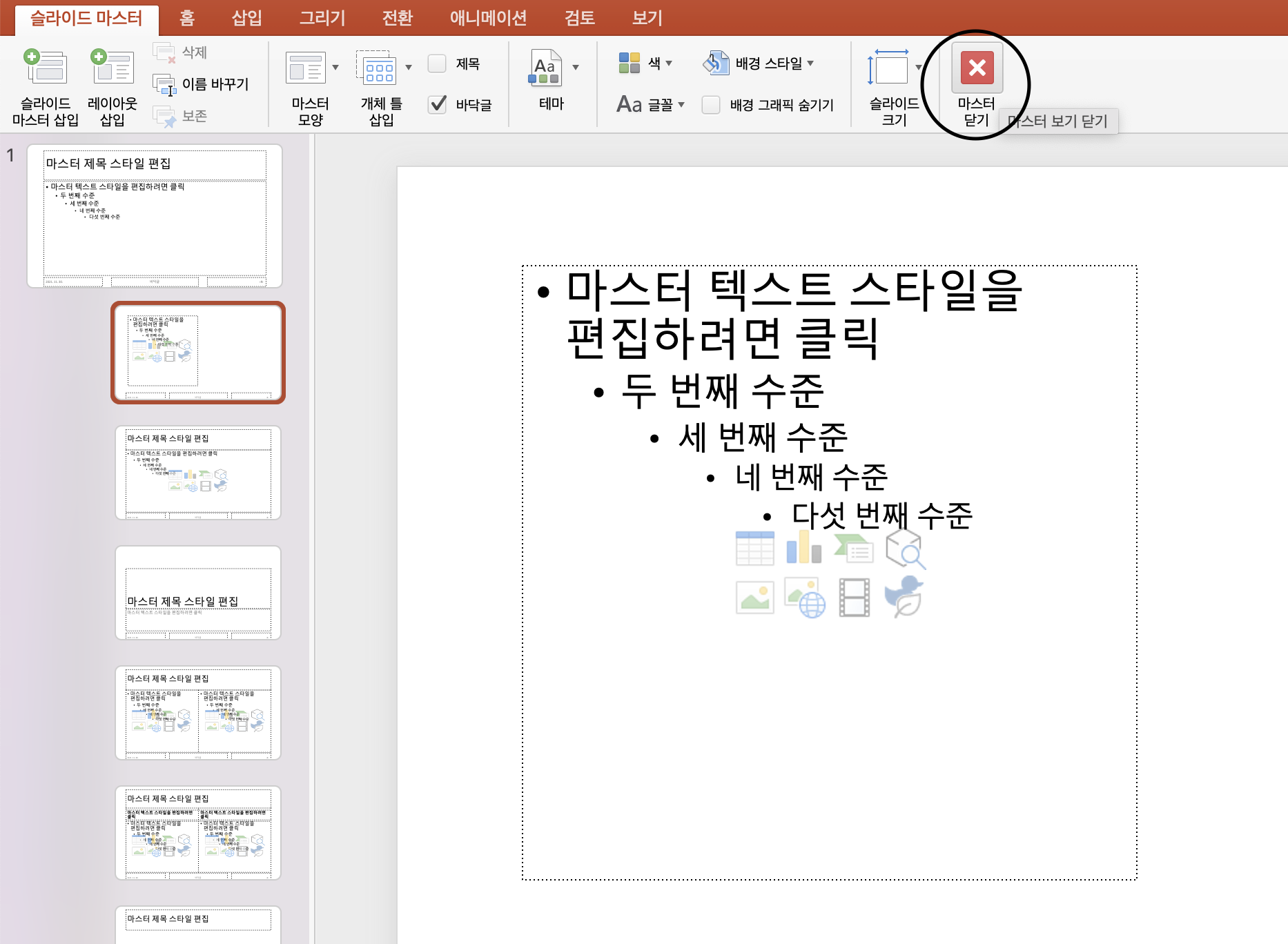 4. 마지막으로 [슬라이드 마스터]메뉴에서 [마스터 닫기]를 눌러 원래 PPT를 편집하던 화면으로 나옵니다.