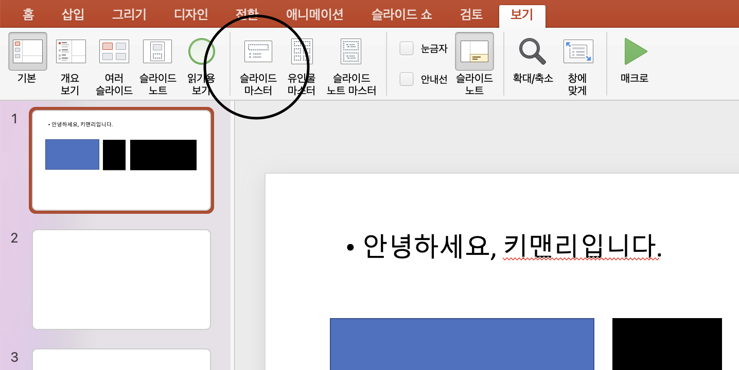 2. 이럴 때는 바로 [슬라이드마스터]로 들어갑니다.